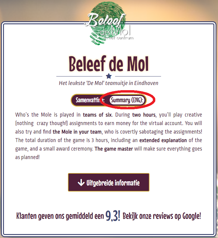 Eindhoven is continuously growing as a tech giant, which automatically means the demand for English outings has increased as well. No worries, we’ve got you covered! Almost all of our activities are available in English. But how will you know what our activities are about? Check out the image on the right! Every activity that’s available in English is summarized in English, simple as that. Click on the ‘Summary (ENG)’ button and there’s an extended summary of the activity. Of course, this might not cover exactly what you want to know. No problem! Give us a call (or send an e-mail) and we’ll answer any questions you might have. Also, most browsers have an option to translate the entire website, and nowadays, that’s quite the accurate translation!
